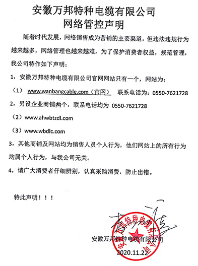 鄭重聲明:安徽萬邦特種電纜有限公司官方網站為:www_wanbangcable_com.ztph.cn,除此之外無任何子網站或合作網站,其余均為假冒偽劣。電話:0550-7621728 13485756353 地 址:安徽省天長市滁州高新技術產業開發區經四路29號